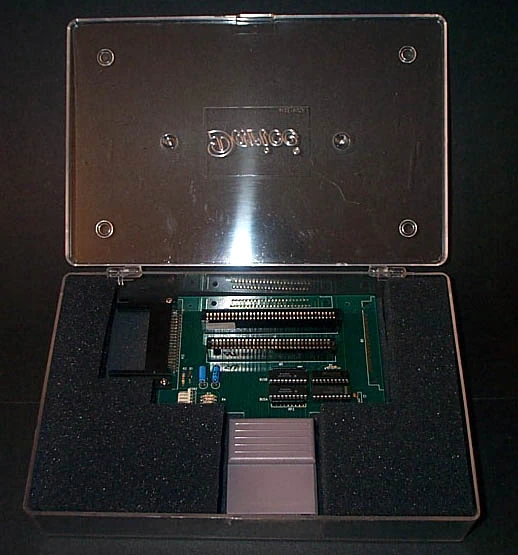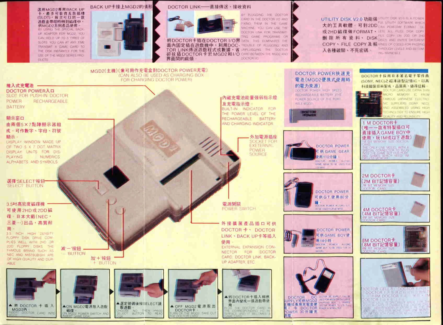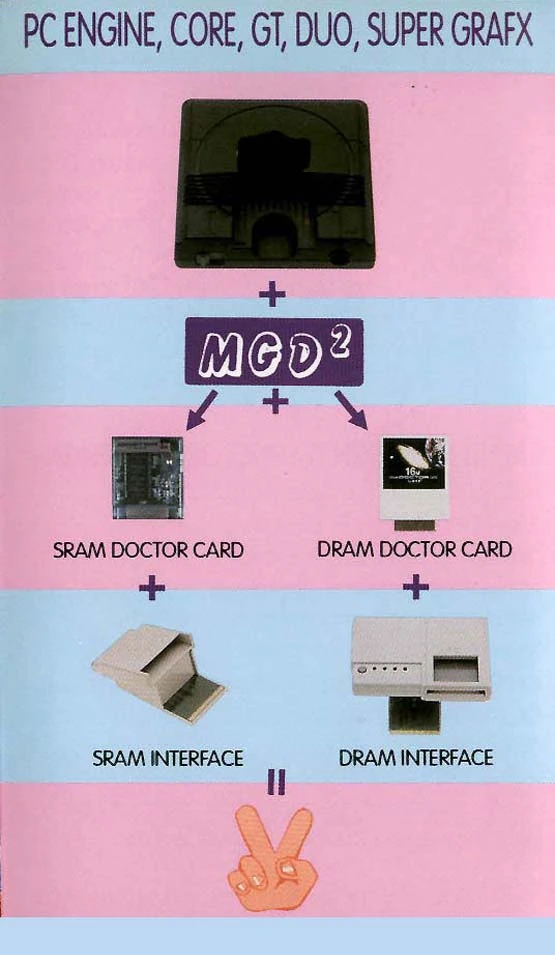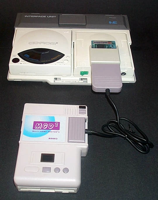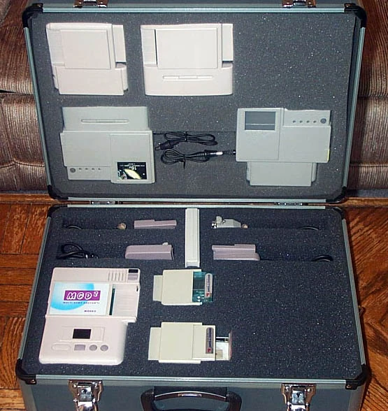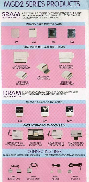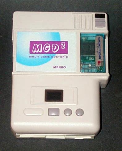 Released in 1991, the Multi Game Doctor 2 by Bung is one of the most versatile copiers there are. The MGD2 has can be used with 7 different systems including the SNES, Genesis, NEO-GEO, PC-Engine, Super Graphics, Game Gear, and Game Boy. The main unit has an LCD screen and three buttons which control the copier's functions. The unit is compatible with gold finger codes, DSP games and has built in 256K of SRAM. It has support for two languages (Chinese and English) and the contents of the memory are maintained when the console's power is turned off. The Neo Geo I/O can playback games up to 136M, the I/O utilizes 4x32M Doctor cards, and one 8M SRAM (thanks Kyuusaku). Games can be backed up on 720K, 800K, 1.2MB, 1.44MB and 1.6MB formats. It had a backup board (for making the initial backups), but it did not come in any protective case, just the bare board, so very few now survive, they are now VERY, VERY rare. The dealer would usualy attach whatever cart conectors the buyer/user needed.