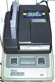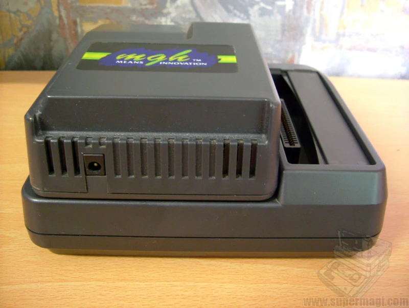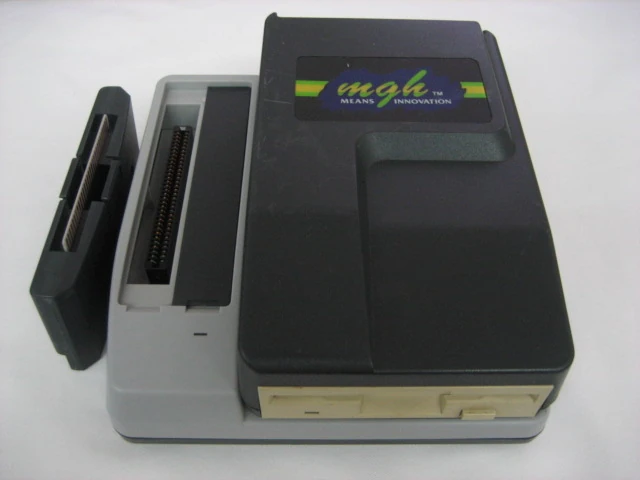 Comment 1: This is the Multi Game Hunter by Venus Corp! This backup unit can be used with both the SNES, and Genesis. It has two cartridge adapter slots on top, for either SNES, or Genesis carts. With a special cartridge and connected to a Genesis, it allows you to play copied Master System games as well. The disk drive on top is removable, but there is no parallel interface. At the time it came out it was the only copier to reliably backup Genesis carts. All operations are controlled from menus using the console's controllers, including disk managment, saveing and loading of both game data and SRAM. The MGH unit requires an external 9V power supply. One disadvantage is that you cannot connect it to your computer. A DSP adapter is available, and you can replace the deprotect with a newer version. There appear to be two versions of the MGH. The original black copier (pictured above) had 16Mbits of RAM, with no way to add more. That means it can't run some of the larger games. The newer grey version comes with 16-24Mbits of RAM and hirom decoders for newer games, the RAM is expandable. All accessories work with both versions of the MGH. More information about both is appreciated! I would also like pictures of the grey unit.